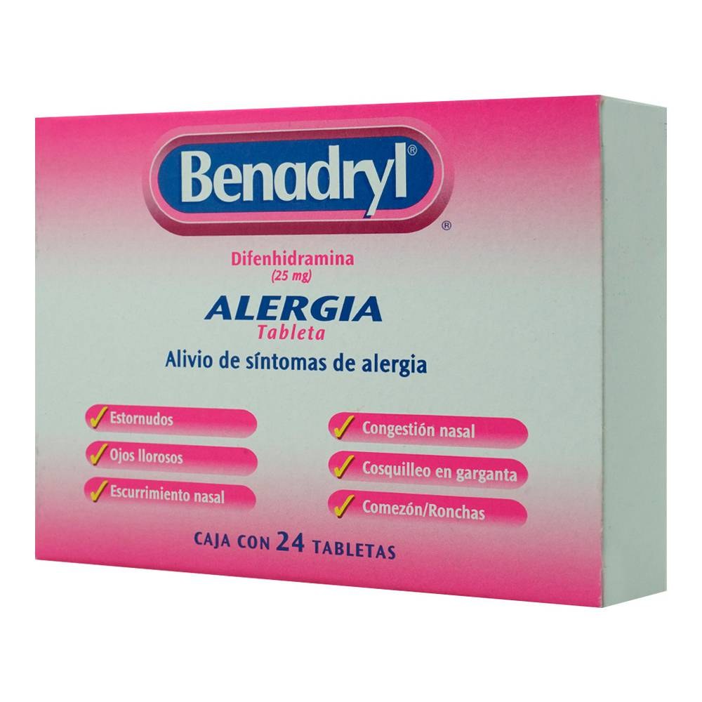 Información de uso y recomendaciones para el producto BENADRYL T 24 25 MG DIFENHIDRAMINA GPO VI. Consulta instrucciones del empaque y, si aplica, orientación profesional.