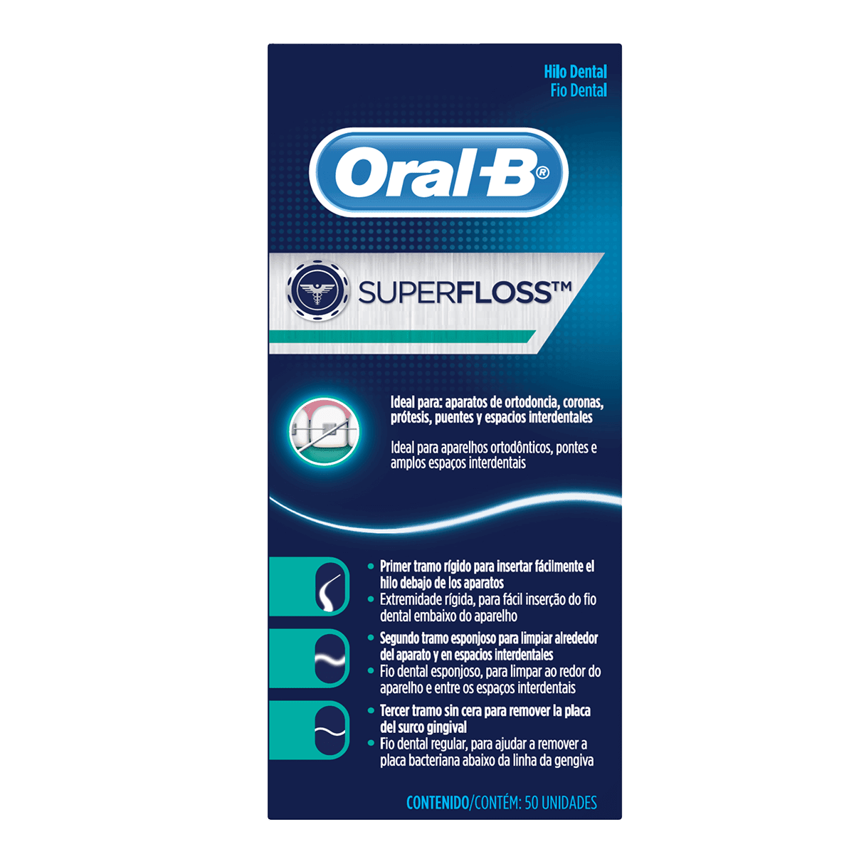 Información de uso y recomendaciones para el producto ORAL B HILO D SUPER FLOSS 50 M. Consulta instrucciones del empaque y, si aplica, orientación profesional.